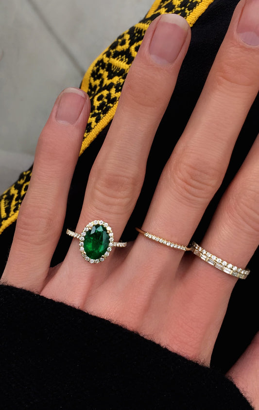 14kt gold and diamond solitaire chrome green tourmaline eternity ring with halo