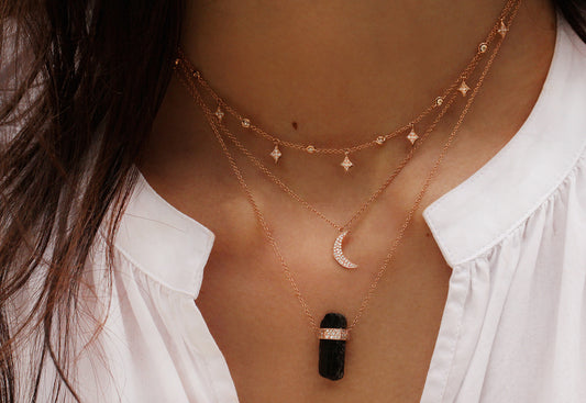 14kt gold and three diamond row black tourmaline crystal bar necklace