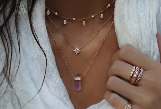 14kt gold teardrop diamond rainbow quartz crystal bar necklace