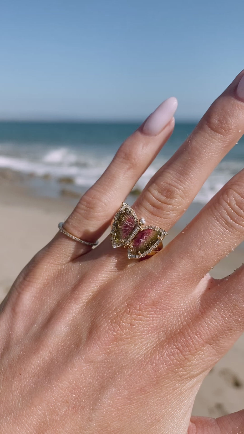 14kt gold and diamond watermelon tourmaline butterfly ring