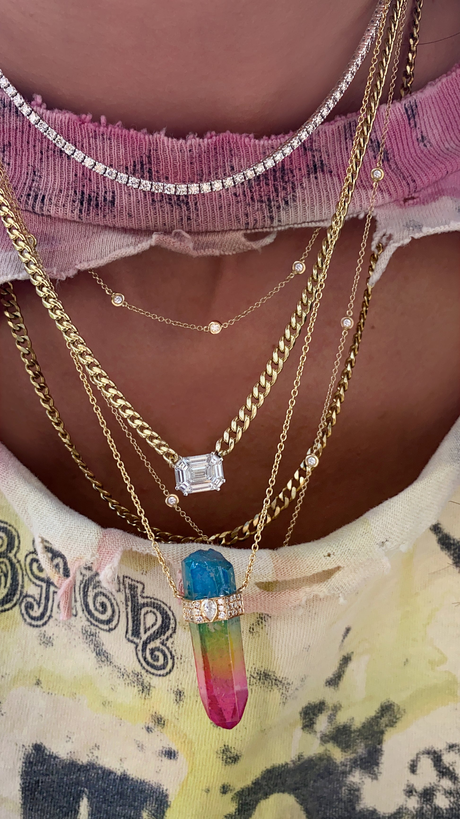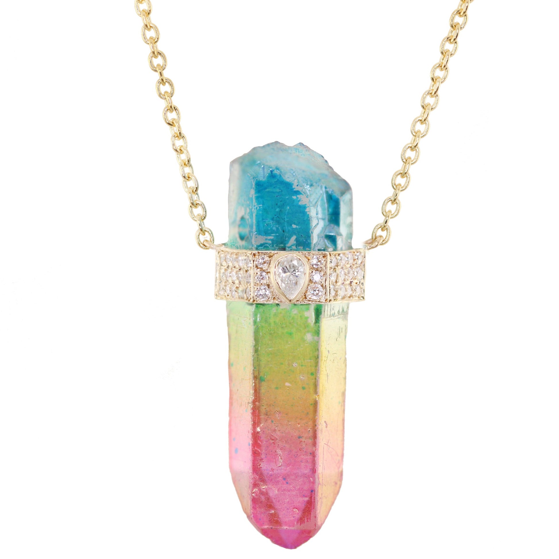 14kt gold teardrop diamond rainbow quartz crystal bar necklace